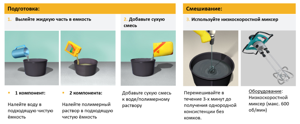 Растворы на основе гидравлического вяжущего (цемента) с гранулированным заполнителем (кварцевый песок), а также различных примесей и минеральных добавок, которые при смешивании с водой схватываются в результате реакции гидратации. - Цементно-полимерные (SikaTop® Seal-107/Sikalastic®- 152 RU)