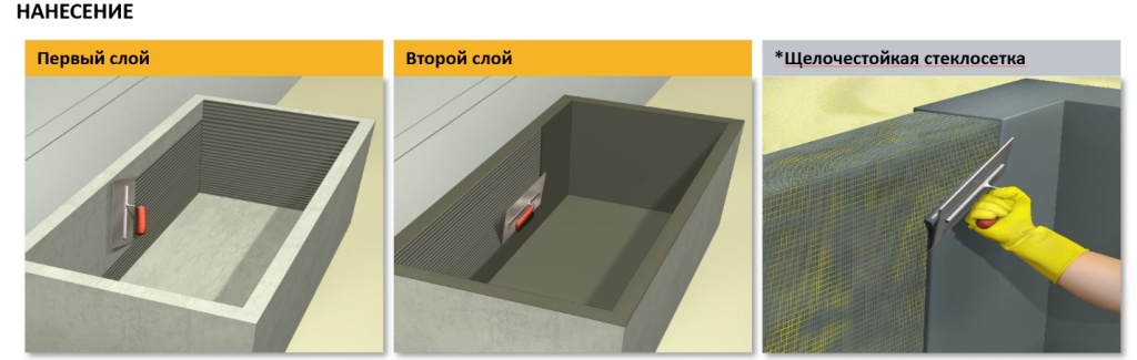 Обмазочные гидроизоляционные растворы на основе цемента всегда наносятся минимум в два слоя. Необходимо равномерно распределить раствор по основанию, избегая его скопления в углах. При нанесении первого слоя раствор необходимо вдавливать в основание. После того как раствор схватился можно приступать к нанесению второго слоя в направлении перпендикулярно первому.