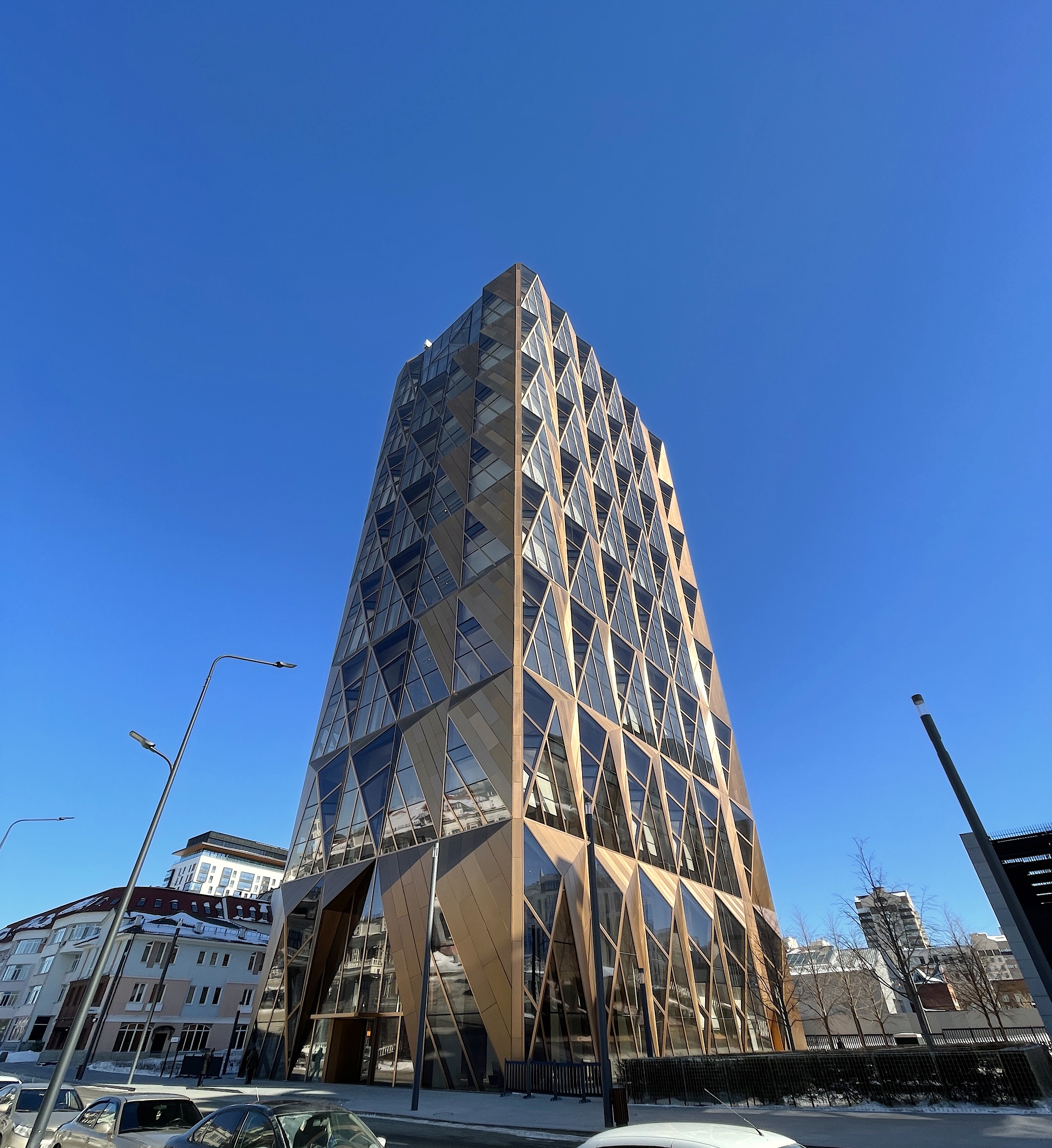 Проект, разработанный британским архитектурным бюро Foster & Partners, в основе дизайна которого заложена структура кристаллической решётки меди, подразумевал изготовление фасадных 3D-модулей больших размеров (184 модуля стандартного размера 10 x 6 метров и весом около 8,5 тонны) и стеклопакетов нестандартной геометрической формы, в том числе и «джамбо»-размеров. Модульное остекление фасада является важным конструктивным элементом обеспечения безопасности здания. Оно должно и выдерживать ветровые и снеговые нагрузки, и быть рассчитано на тепловое расширение, постоянно передавать нагрузки на опорную конструкцию, переносить атмосферные воздействия в течение многих лет. Соответственно, необходимо применять проверенные и надёжные продукты, такие как инженерные силиконовые клеи-герметики линейки Sikasil®.