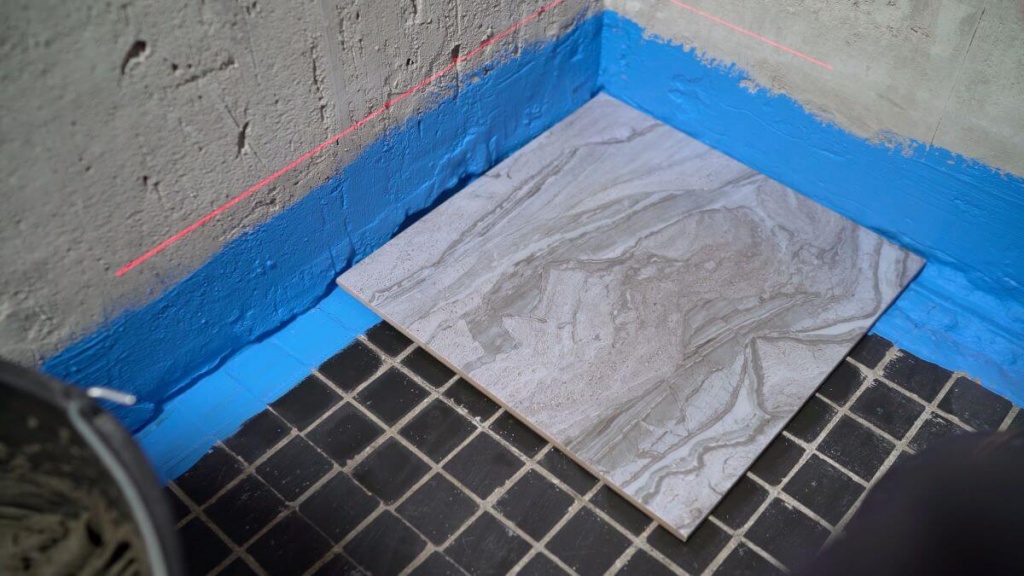 Гидроизоляционные работы не являются обязательными, но крайне желательны для проведения. Во-первых, качественная защита от влаги позволит на долгий срок сохранить целостность слоя плиточного клея, исключит появление трещин, размножение бактерий, грибков, возникновение неприятных запахов. Во-вторых, она исключит залив соседей, если случайно ванна набралась через край, была повреждена подводка, стык или трубы. Для гидроизоляции разработан широкий перечень обмазочных составов, представляющих из себя сухие смеси, разводимые водой или полимерным компонентом, или же готовые жидкие составы на акриловой основе. Они наносятся на поверхности при помощи кисти, валика или шпателя, быстро сохнут, образуя монолитное защитное покрытие. Покрывается не только пол в помещении, но и стена на высоту 20–40 см. Все углы следует проклеить специальной гидроизоляционной лентой.