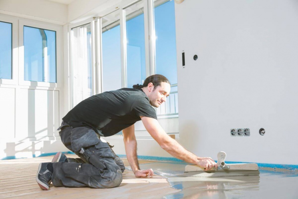 • Отремонтируйте и отшлифуйте бетонное основание. Цементную пыль соберите пылесосом и только после этого заливайте стяжку. Для усиления адгезии (сцепления) подойдет однокомпонентный Sika® Primer-215, а для самой стяжки – самовыравнивающаяся смесь Sika® Level Universal со сроком высыхания 24 часа. Смесь легко растекается по поверхности и имеет низкий уровень усадки – при высыхании не появятся трещины. Ходить по такому покрытию можно будет уже через 4 часа. Бетонные полы в качестве основания более практичны, и если есть такая возможность, стоит залить стяжку. Технически реализовать такую возможность не получится только на вторых этажах частных домов, где перекрытия выполнены из дерева.