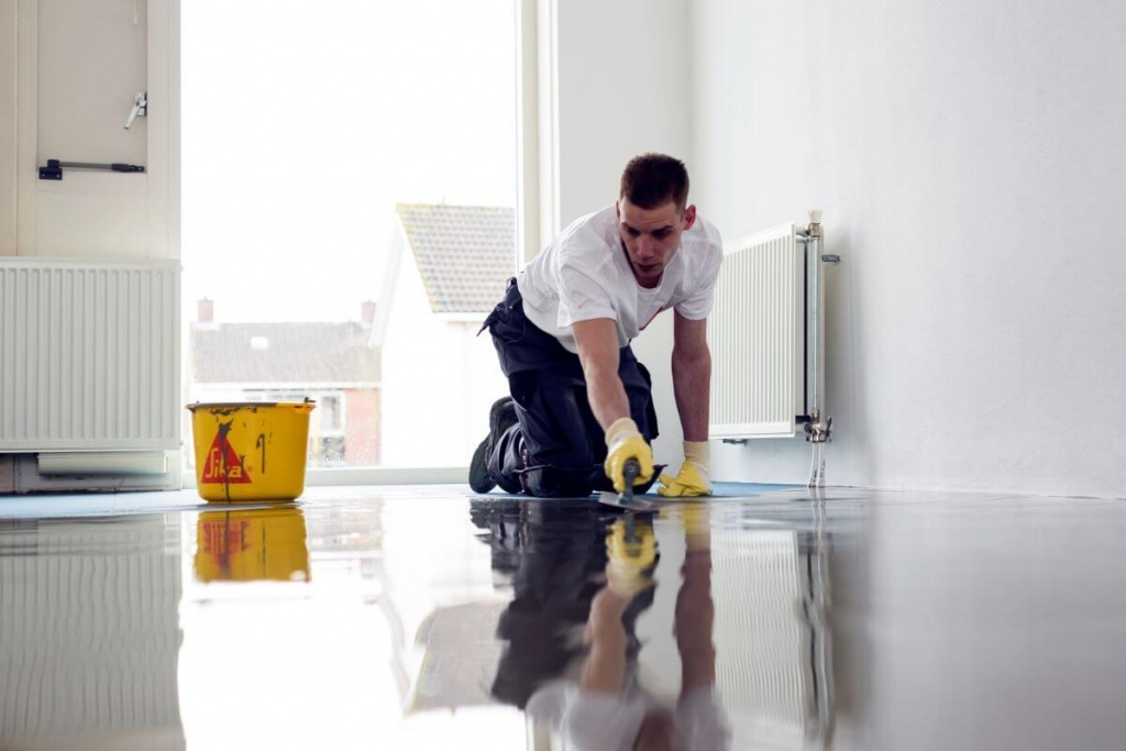 - Подготовительные работы. Включают в себя выравнивание или шлифование базового основания с затиркой бугорков и выступов, устройство полимерцементной или полимерной стяжки пола, нанесение грунтовки. Все это необходимо, для того чтобы создать надежное и идеально ровное базовое основание, на котором можно будет правильно распределить полимерную смесь.
