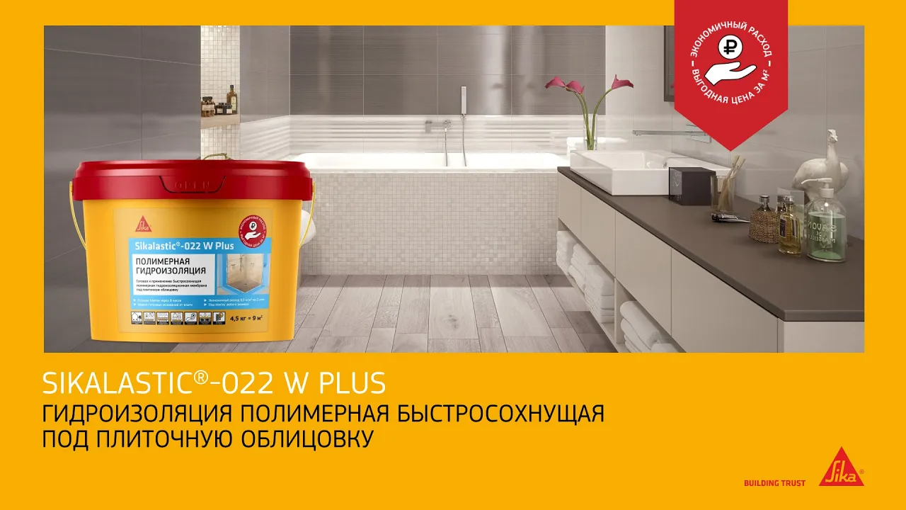 Sikalastic®-022 W Plus - высокоэластичная быстросохнущая, не содержащая растворителей, однокомпонентная, бесшовная, готовая к применению гидроизоляционная мембрана для герметизации стен и полов перед созданием плиточной облицовки во влажных помещениях, в том числе с подогревом. Можно наносить на цементные и гипсовые основания.
