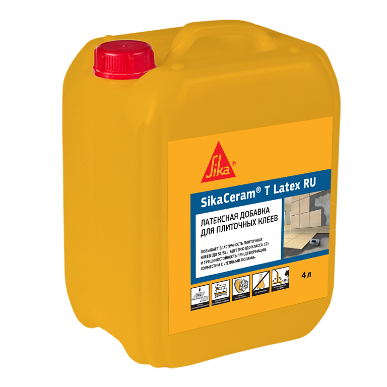 SikaCeram® T Latex RU – раствор синтетического латекса для затворения цементных плиточных клеёв. Применение SikaCeram® T Latex RU в неразбавленном или разбавленном 1 : 1 с водой виде для затворения клеёв позволяет повысить их адгезию, деформативность (эластичность), морозостойкость и трещиностойкость. Подходит для затворения цементных клеев SikaCeram®.